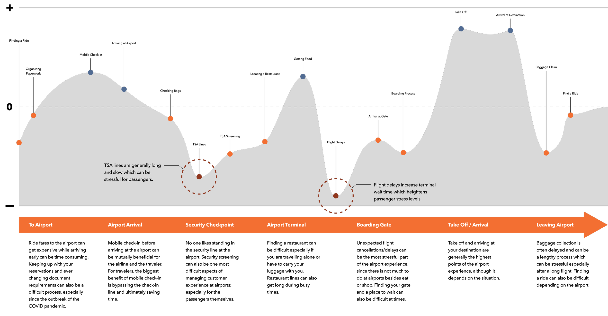 To help us build a complete end-to-end understanding of Morgan’s airport experience, we developed a journey map to document their potential emotional path while progressing through various obstacles at DFW. Unsurprisingly, we found that much of the experience fell into the negative range of emotions.