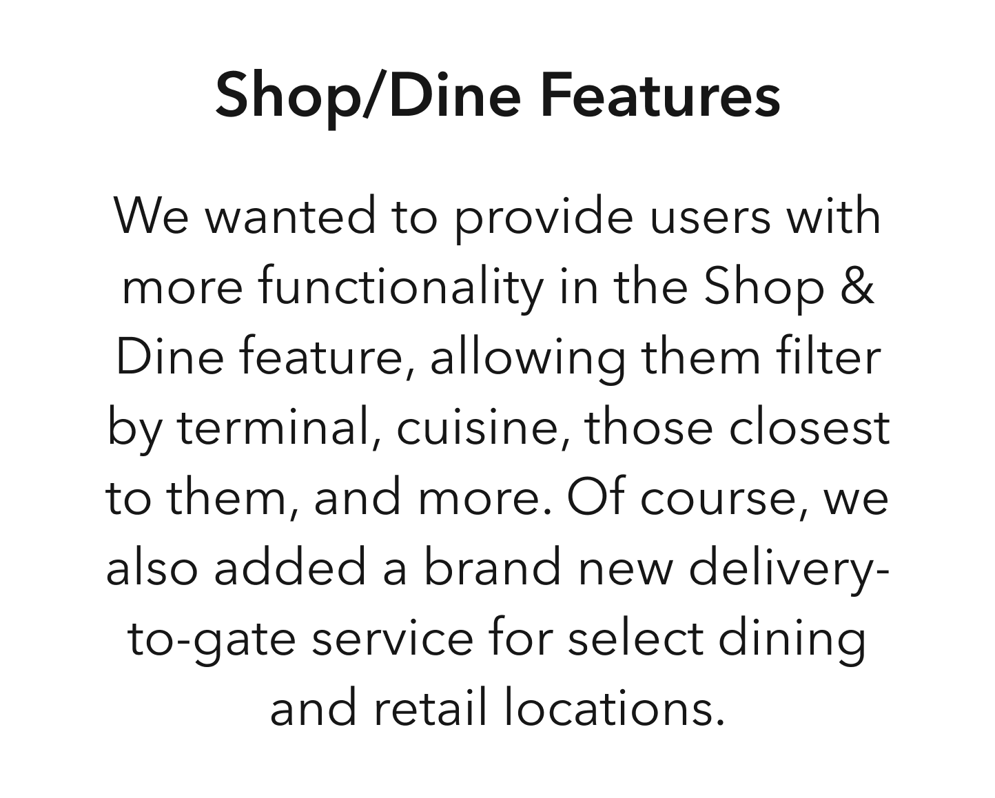 From the usability test results, it was clear that we needed to make it simpler for users to find the shops and restaurants that best suit their needs. In addition, we needed to refine the journey planning tool to help users make the most of their time and navigate effortlessly through DFW.