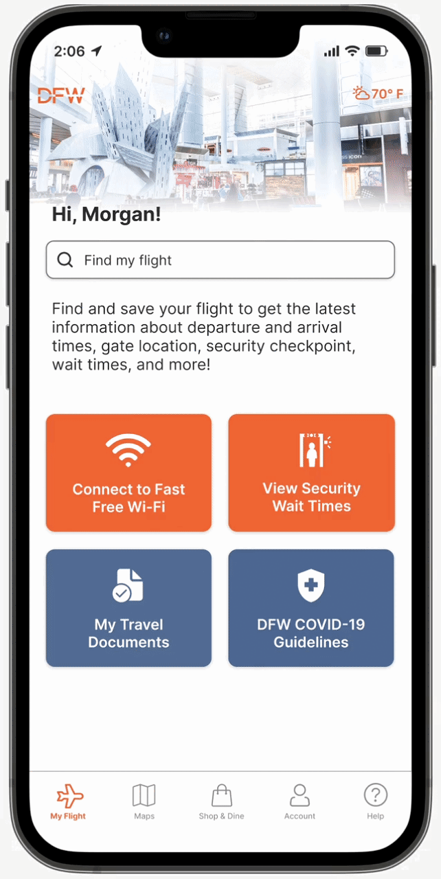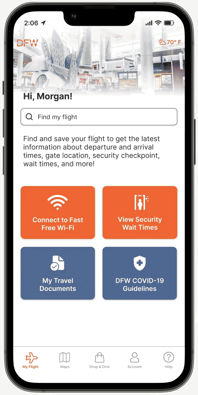 With these challenges in mind, our team reimagined the Dallas Fort Worth International Airport (DFW) iOS mobile app with new features like the journey planner, travel document organizer, and restaurant pre-order and delivery-to-gate. By utilizing digital solutions to facilitate the physical airport experience, we aim to help DFW increase throughput and sales while minimizing passenger wait time and frustration.