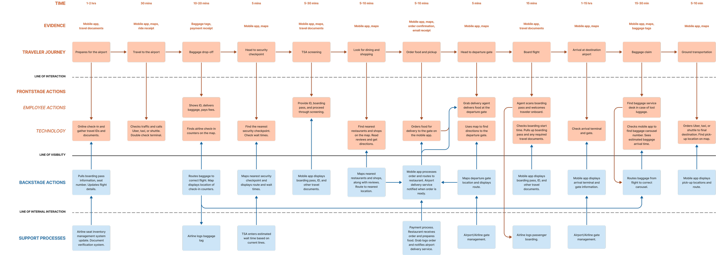 In order to have a full appreciation for any potential solution, we needed to go one step further beyond simply defining the problems to actually mapping out these digital-to-physical touchpoints through the creation of a service blueprint. During the ideation phase, we were able to use the service blueprint to identify specific aspects of DFW’s operations requiring further consideration.