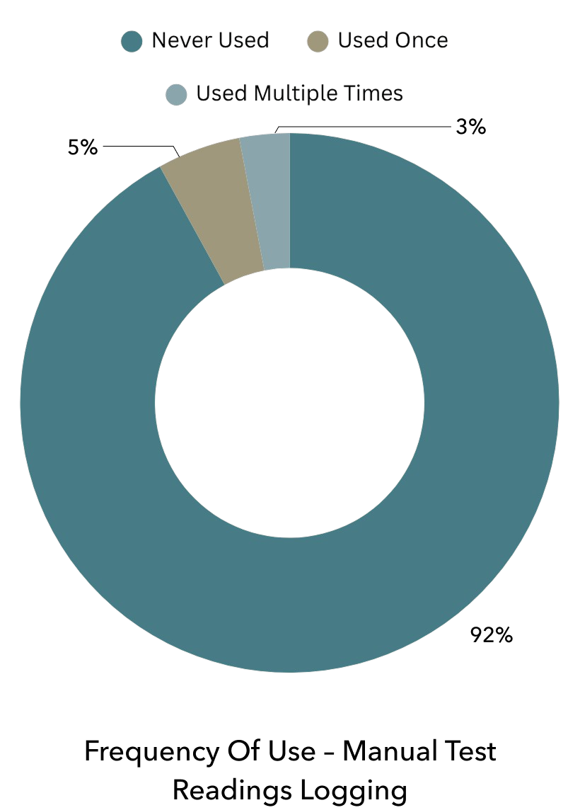 Next, I analyzed how frequently users followed Sutro’s Chemical Recommendations by marking alerts as completed subsequent to each test reading, providing insight into the feature’s overall usefulness and effectiveness. In addition, I reviewed engagement with the Manual Test Readings Logging feature to validate our assumption that it was underutilized due to poor visibility within the app.