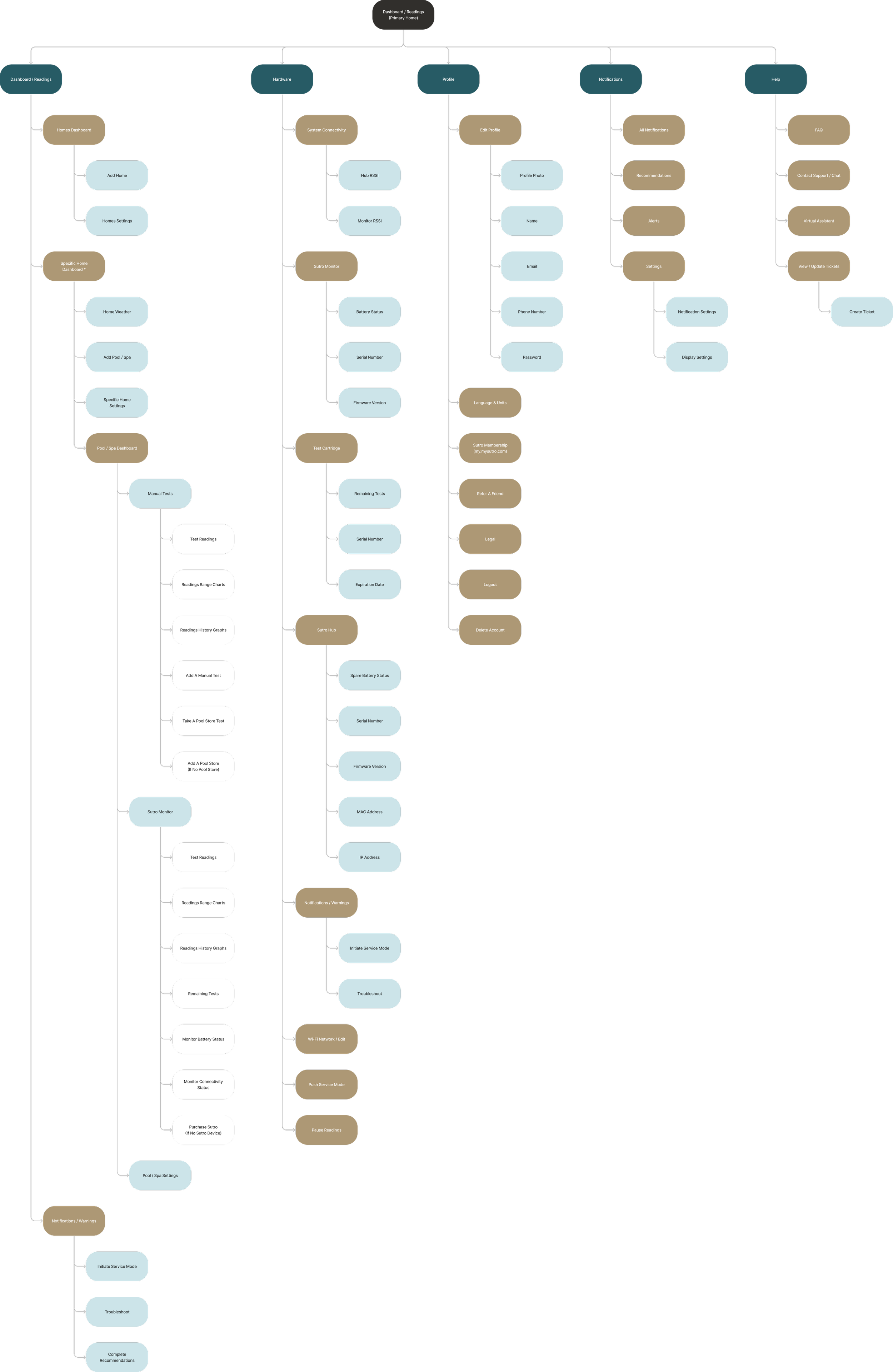 Within the Pool/Spa dashboard, I also needed to merge Sutro Monitor readings with manual test readings (furthermore, Manual Test readings included both at-home tests and pool store tests) into one cohesive, intuitive display. Mapping this hierarchy made it possible to clearly visualize how each layer of the experience would be interconnected and organized.