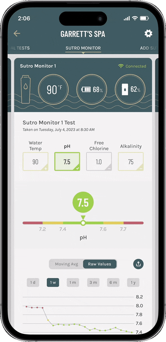 The Pool/Spa Dashboard required a deeper design exploration due to its unique criteria to merge Sutro Monitor readings with manual test results into a single, intuitive interface. Manual tests include both at-home readings as well as pool store tests – the latter helping to align the consumer app experience with Sani Marc’s in-store testing and customer management system for future B2B integration.